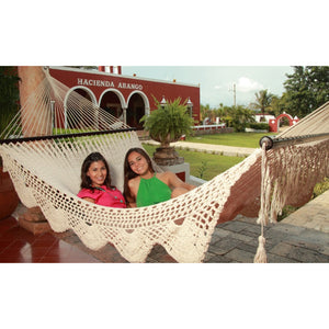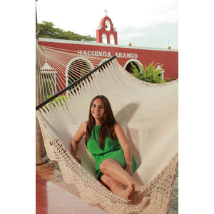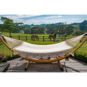 A very attractive hammock in natural off-white cotton with dark wooden spreader bars and crochet fringe pattern. Traditionally handmade in Mexico in a close diamond weave pattern.