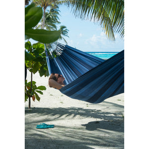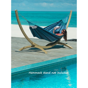 Double size full fabric hammock, suitable for sharing with a loved one, or luxuriate in comfort alone.