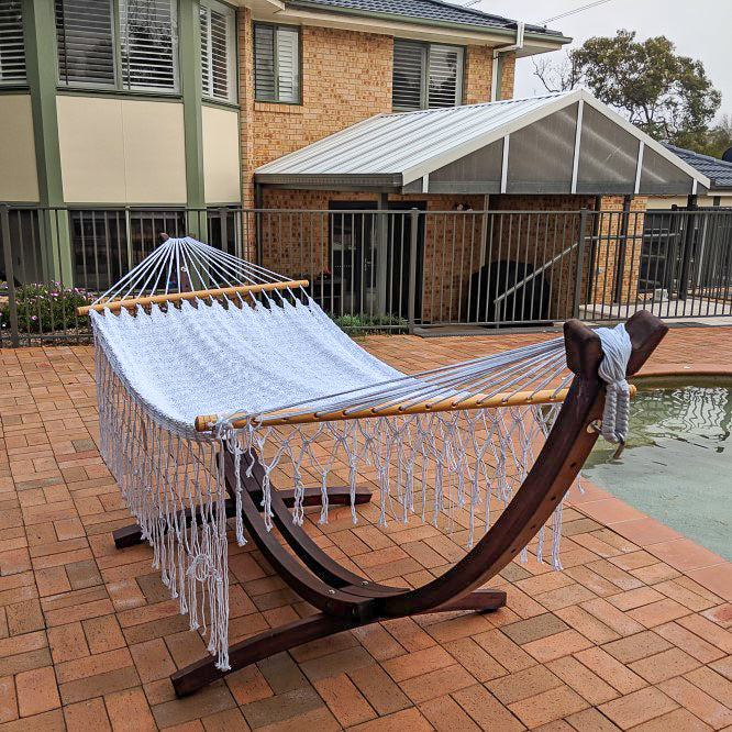 Our hammock stands come in two options, a wood or metal stand. Both are a unique design that allows the stand to to fit hammocks long than the stand via an adjustable hook system on the rear of the stand.
